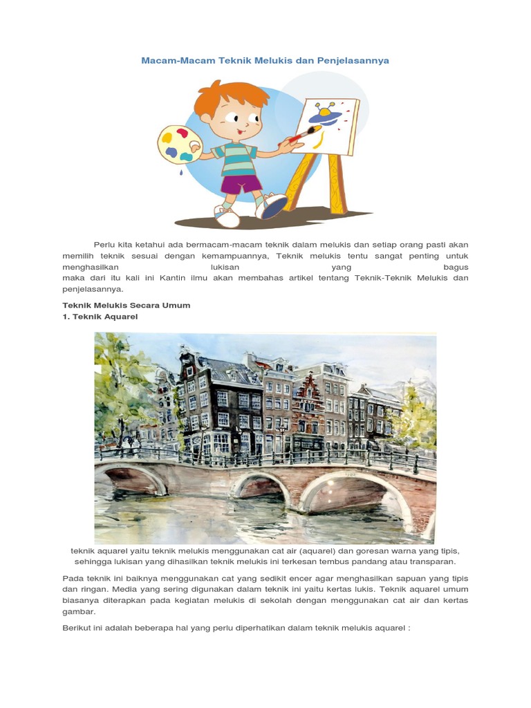 Teknik Melukis Dengan Cat Air Dengan Sapuan Yang Tipis ... from imgv2-2-f.scribdassets.com Banyak para pelukis yang menggunakan teknik ini untuk membuat karya yang bisa dijual dengan harga yang tinggi. Teknik aqurel adalah teknik melukis dengan menggunakan cat air (aquarel) dengan sapuan warna yang tipis, sehingga lukisan yang dihasilkan bernuansa transparan. Cara mewarnai lukisan wajah, melukis dengan cat minyak. Masih banyak lagi nama pelukis terkenal di dunia yang menggunakan teknik melukis dengan cat air ini. Untuk menutupi (sesuatu) dengan (seni) teknik melukis menggunakan cat yang terbuat dari pewarna yang tersuspensi atau larut. Cat air bisa bergerak dan bereaksi terhadap perintah pelukisnya. Digunakan untuk menggambar dengan cat air, namun yang paling umum digunakan adalah teknik wet on wet. Melukis dengan cat akrilik adalah pilihan yang tepat.