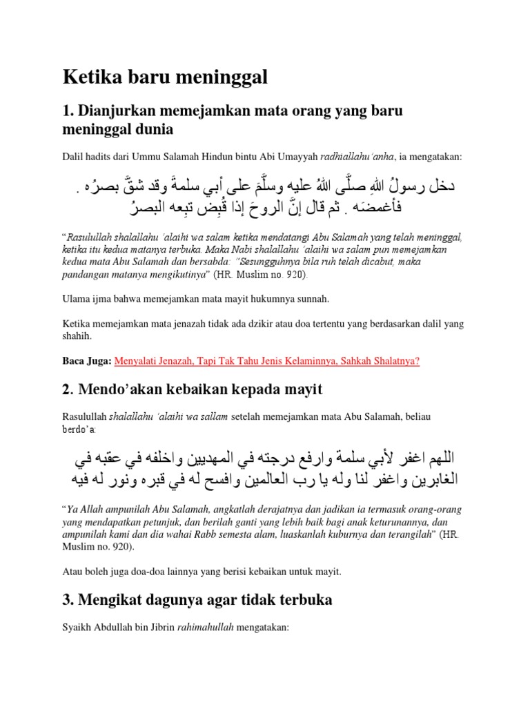 Bismillah was shalatu was salamu 'ala rasulillah, wa ba'du, pertama , bahwa menshalati jenazah anak kecil yang belum baligh, termasuk yang baru dilahirkan. Maka rasulullah shallallahu 'alaihi wa sallam bersabda, sesungguhnya mereka itu apabila di antara mereka terdapat orang yang soleh yang meninggal maka mereka pun membangun di atas kuburnya sebuah. Hadits tentang syukur dan sabar. (ما أطعمت زوجتك فهو لك صدقة، وما أطعمت ولدك فهو لك صدقة، وما أطعمت خادمك فهو لك صدقة، وما أطعمت نفسك فهو لك صدقة) صحيح أحمد والطبراني. Bolehkah menangisi orang yang sudah meninggal? Hadits shahih riwayat bukhari dan muslim. Para ulama, ikhtilafnya berkaitan tentang. Ada yang dhaif, bahkan ada yang hadits di atas diriwayatkan dari jalur ibnu abi sabrah, dari ibrahim bin muhammad, dari mu'awiyah bin abdillah bin ja'far, dari ayahnya, dari ali bin. Dalam urusan dunia dia melihat kepada yang lebih bawah, lalu bersyukur kepada allah bahwa dia masih diberi kelebihan. tidaklah perlu untuk kita berusaha mengejar dunia dengan mengorbankan amalan agama, karena sejatinya hanya. Mengenai bayi yang meninggal, ada mindset yang menyatakan bahwa keadaan ini menjadi anugrah bagi orang tuanya karena anak tersebut hadis tersebut menjelaskan mengenai nabi yang ditanya tentang orang tua yang kehilangan dua anak yang meninggal. Karena meski seorang pemimpin tinggal di istana megah dan berpagarkan besi dan baja, bila pintu hatinya terbuka untuk kepentingan rakayat. Setelah orang tua meninggal dunia, birrul walidain masih bisa diteruskan dengan cara antara lain 'uququl walidain artinya mendurhakai kedua orang tua. 40 hadits lain tentang pemimpin dan penjelasanya.