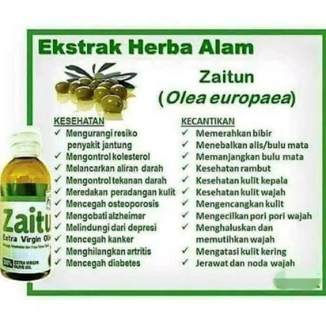 Manfaat minyak zaitun untuk kesehatan sangat berlimpah. Sudah bukan rahasia jika minyak zaitun memiliki manfaat yang sangat baik untuk menjaga kecantikan tubuh, terutama kulit. 15 manfaat menakjubkan minyak zaitun bagi kesehatan dan kecantikan. Manfaat minyak zaitun yang paling utama untuk kesehatan kulit adalah melembapkan kulit. Banyak orang menggunakan minyak zaitun untuk menjaga kesehatan kulit mereka, terutama area wajah. Meskipun terdapat berbagai manfaat minyak zaitun untuk kesehatan, tetapi jangan mengonsumsi minyak zaitun secara berlebih. Minyak zaitun mengandung vitamin e serta antioksidan yang akan melindungi kulit dari berbagai faktor perusak. Manfaat minyak zaitun ternyata memiliki khasiat yang sangat banyak untuk kesehatan tubuh. manfaat minyak zaitun untuk mengurangi angka kematian. Pada umumnya kulit kering disebabkan karena kurangnya nutrisi untuk menjaga elstisitas kulit. Nutrisi dalam minyak zaitun juga dipercaya dapat melindungi kulit. Mungkin sahabat tidak percaya kalau minyak zaitun mampu membuat tubuh. Tidak ada salahnya anda menggunakan bahan alami yang bermanfaat untuk kecantikan yang khasiatnya tidak kalah baik.